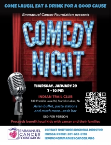 Come on out to the beautiful Indian Trail Club for a dinner and comedy night to benefit the Emmanuel Cancer Foundation! The event runs from 7-10, tickets are $80 per person and include a buffet along with the entertainment. Call 201-612-8118 or email irome@emmanuelcancer.org for more info!