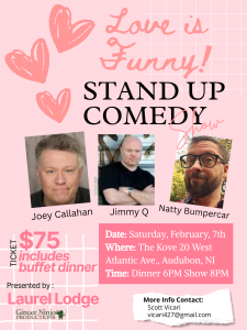 Come one out to the beautiful Kove Restaurant and enjoy a comedy show for the Laurel Lodge! Headlining this show is Joey Callahan (Comedy Central, Borgata, Edinburgh Fringe Festival), featuring Jimmy Q (Caroline’s, Stand Up New York) and your host Natty Bumpercar (Greenwich Village Comedy Club).